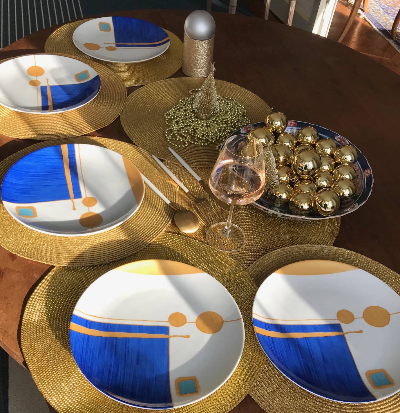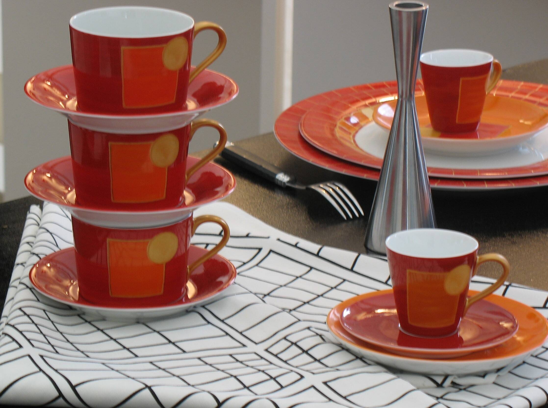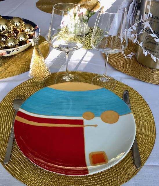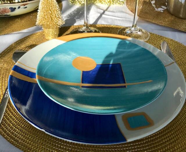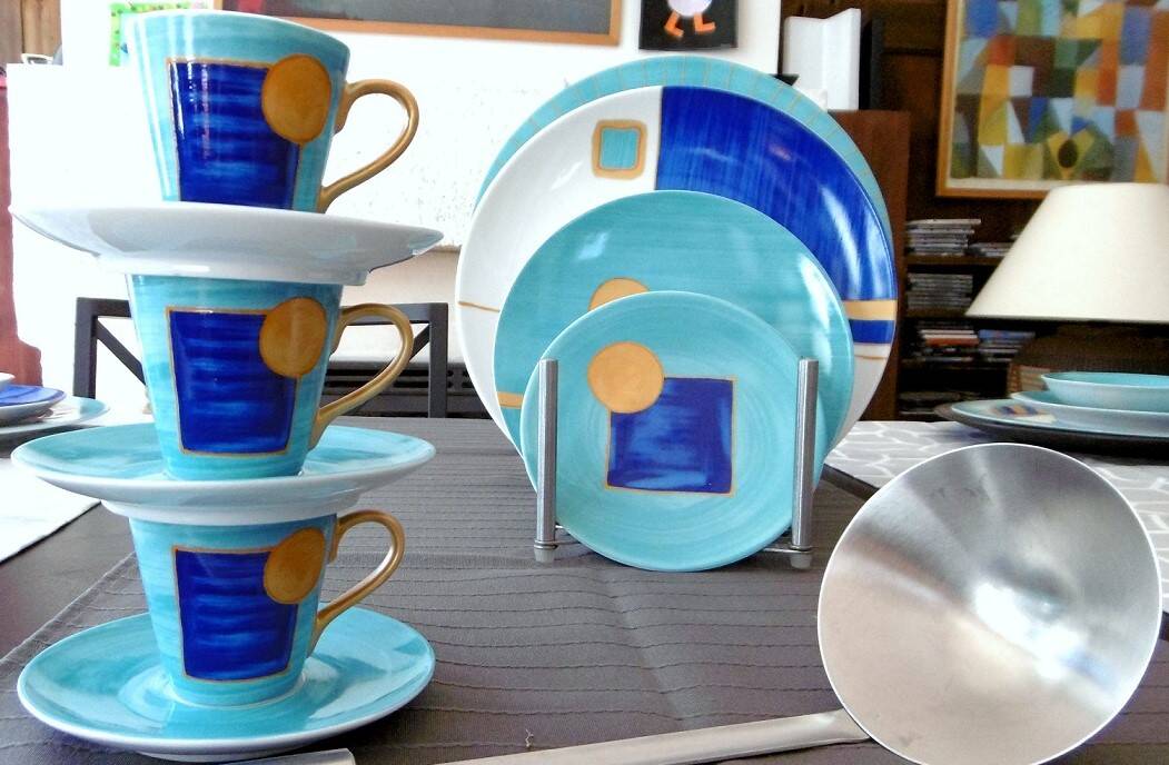 Passionnées par la correspondance des couleurs, et Inspirées par Kandinsky, Klimt, Klee, elles voulaient de l'art dans l'assiette avec des motifs géométriques, des couleurs et de l'or. Et surtout un décor dessiné et peint à la main ou le geste libre de l'artiste avec un savoir- faire unique dégage émotion et subtilités.