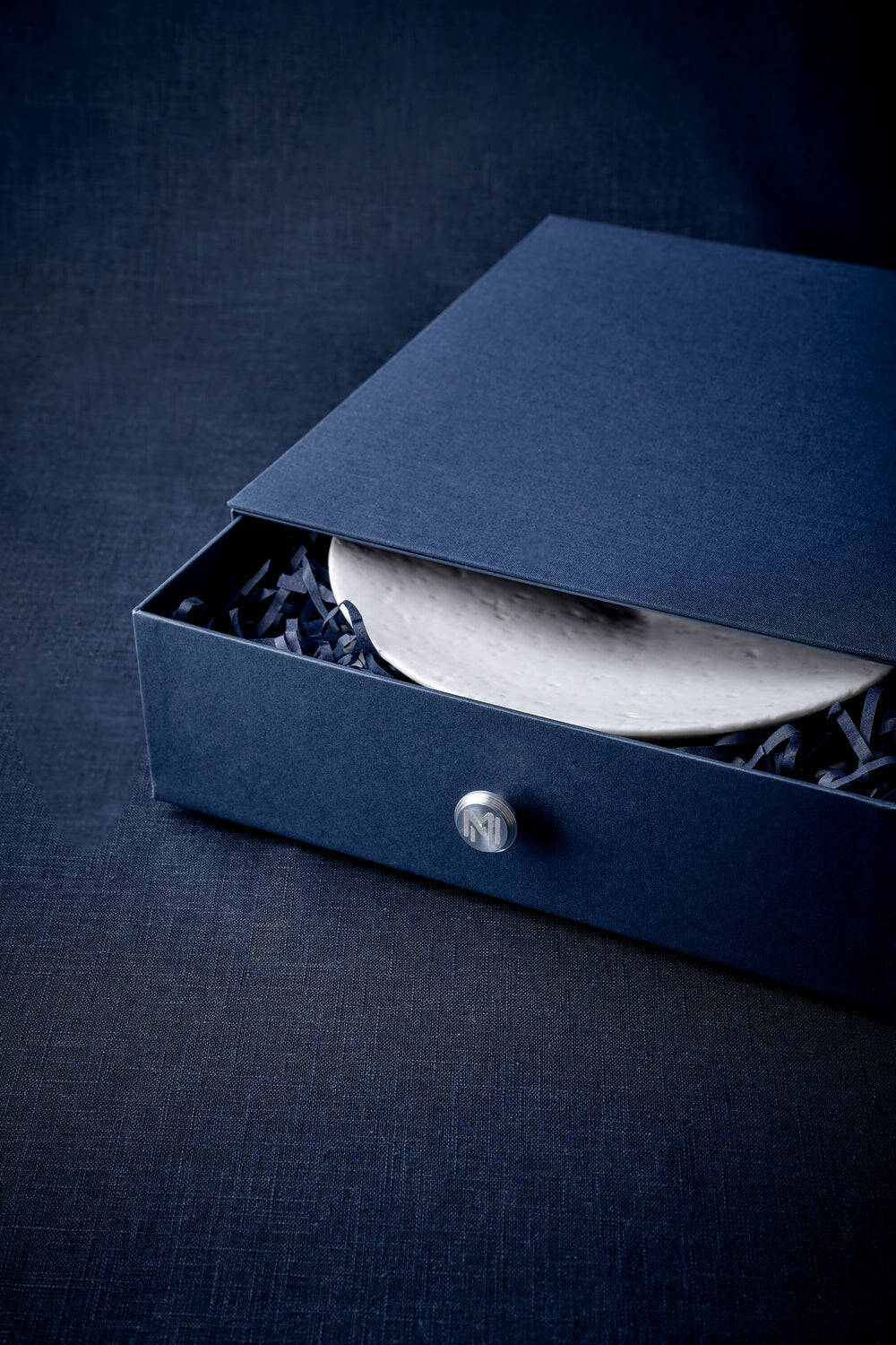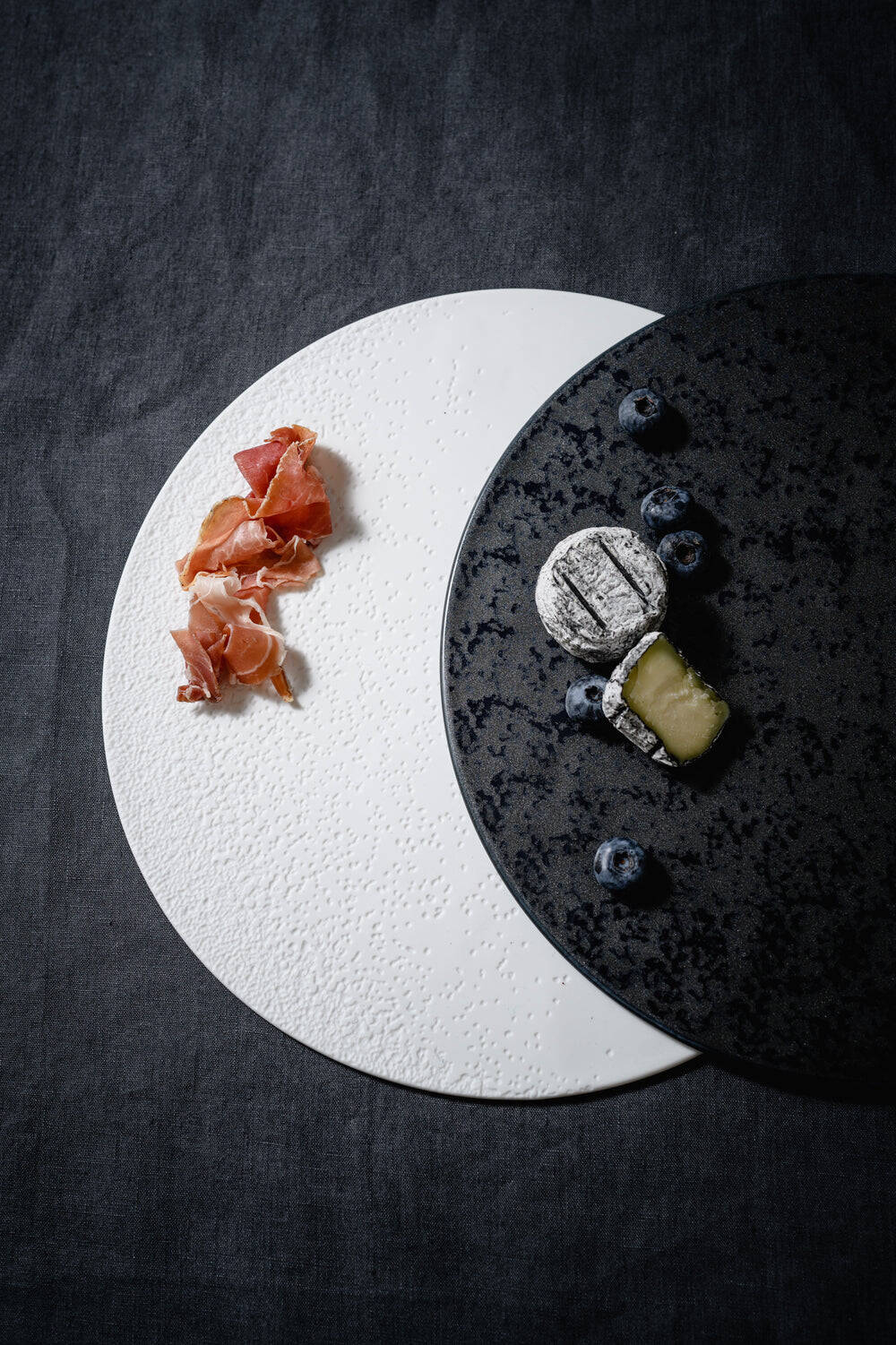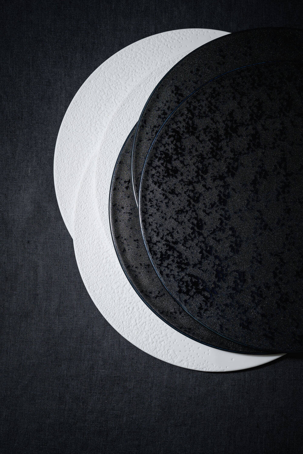 - Luna, inspirée des éclipses lunaires, associe deux plats complémentaires : l’un blanc, gravé à la main pour rappeler la surface de la lune, l’autre noir, métallisé et putoisé de bleu foncé, évoquant la profondeur d’une nouvelle lune.