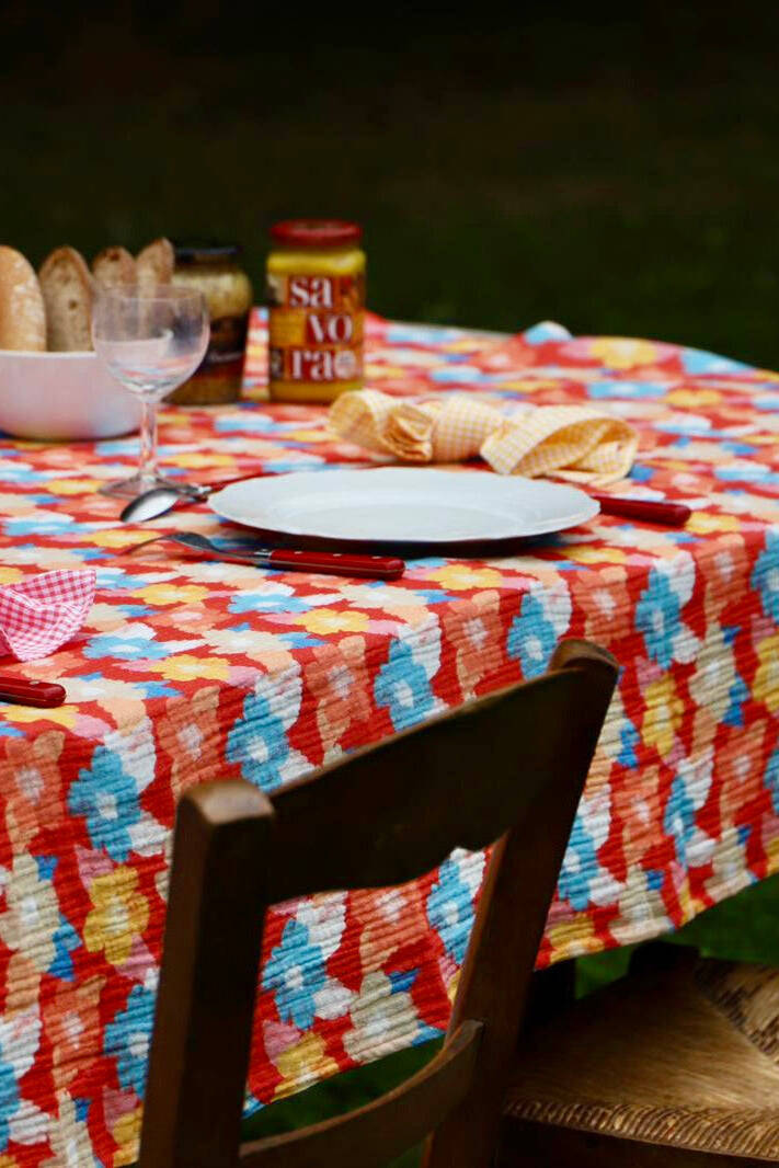 Serviettes, nappes, sets et chemins de table deviennent des toiles de création où s’expriment couleurs vibrantes, motifs exclusifs et matières naturelles. Chaque produit raconte une histoire : celle d’associations audacieuses, de coups de cœur textiles et d’un amour sincère pour les moments partagés.
