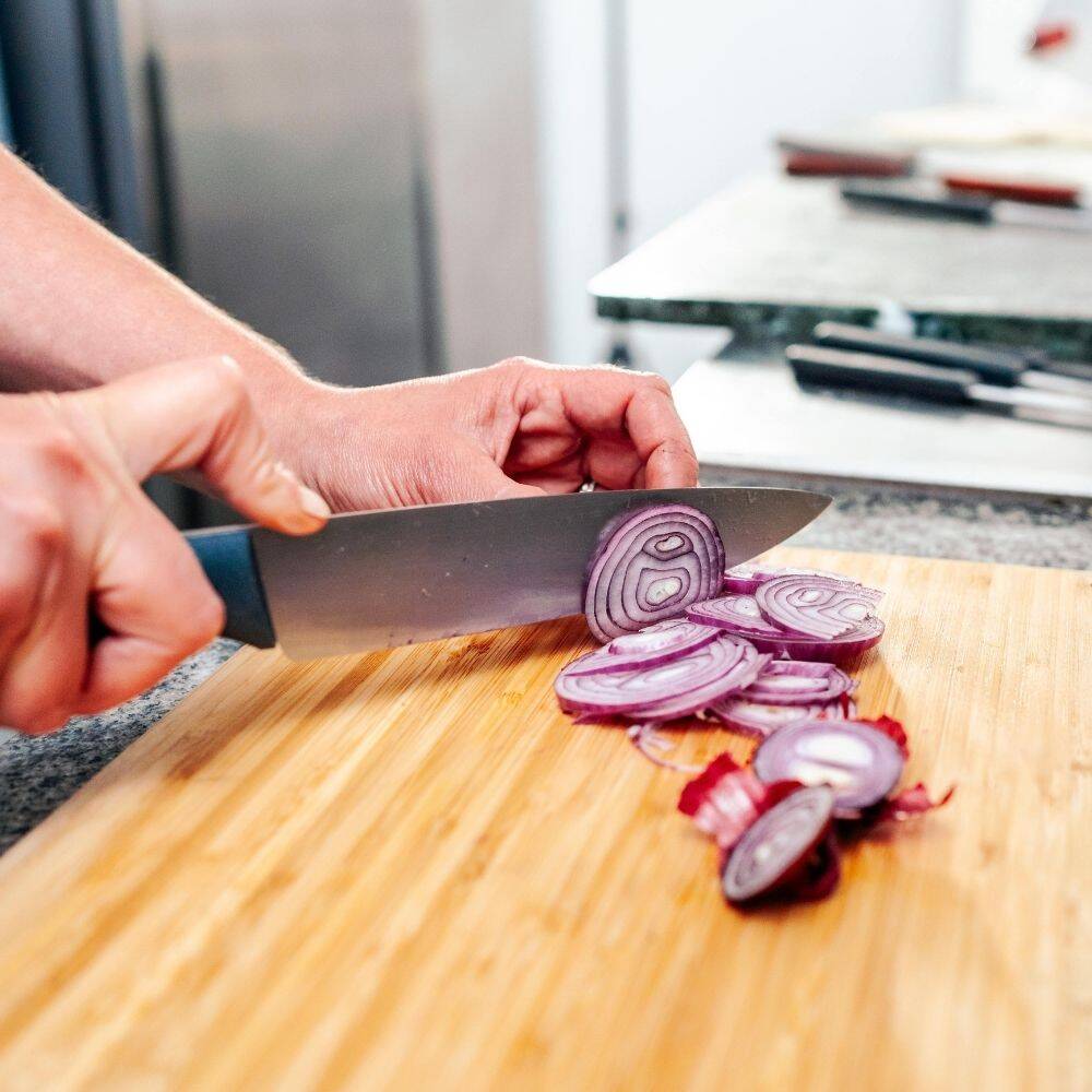 - Couteau de chef : polyvalent et parfaitement équilibré, il hache, tranche et émince avec fluidité grâce à son mouvement de balancier