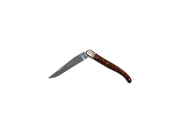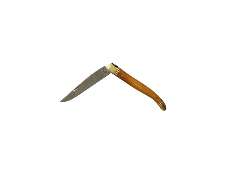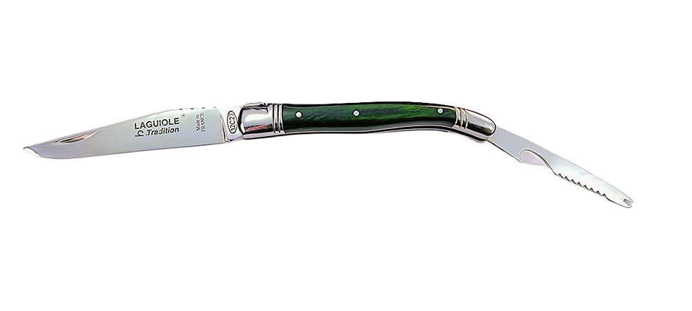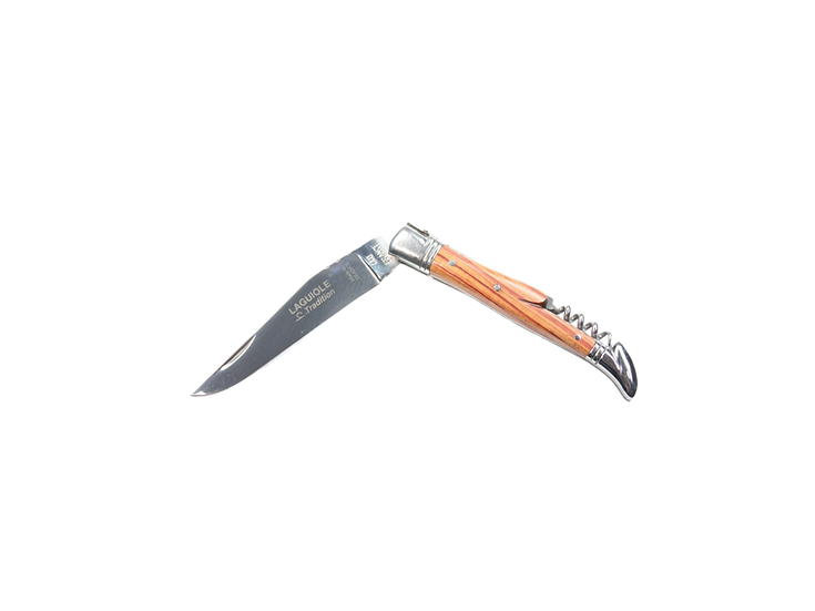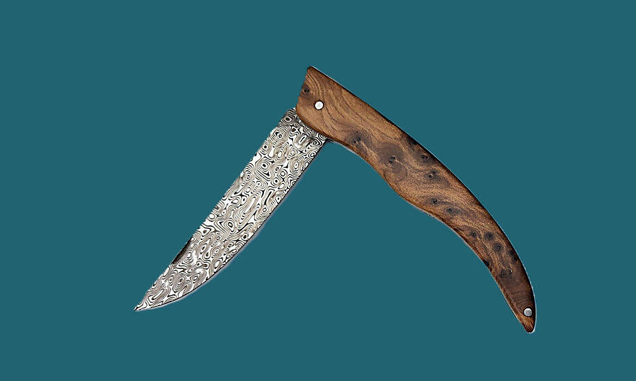 Du 9 cm discret au 12 cm affirmé, une mitre ou deux, avec tire-bouchon intégré ou dégorgeoir pour les pêcheurs, chaque modèle répond à un usage précis tout en reflétant un style singulier. Bois d’olivier, ébène profond, amourette précieuse, corne blonde ou noire : les manches se déclinent en un éventail de matières nobles soigneusement sélectionnées.